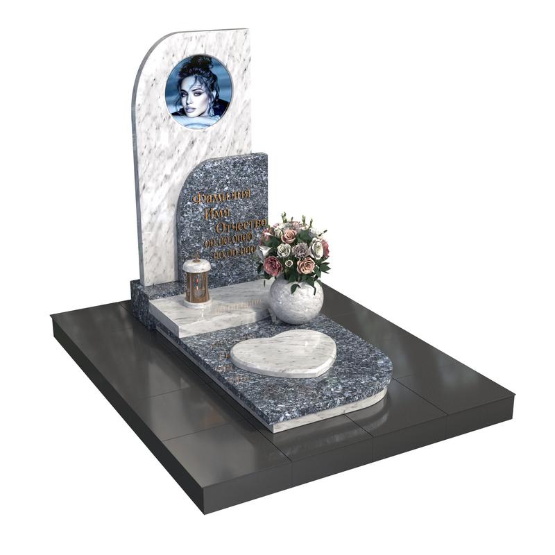 Мягко изогнутая форма стелы с плавными линиями напоминает лёгкое дыхание, а портрет в круглом оформлении, белое мраморное сердце и светлая ваза с цветами подчёркивают утончённость и личный характер композиции.
